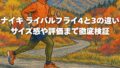 | 全体のフィット感 | 軽く包む感覚 | 密着感が高く安定 | 長距離なら余裕を持たせると◎ |